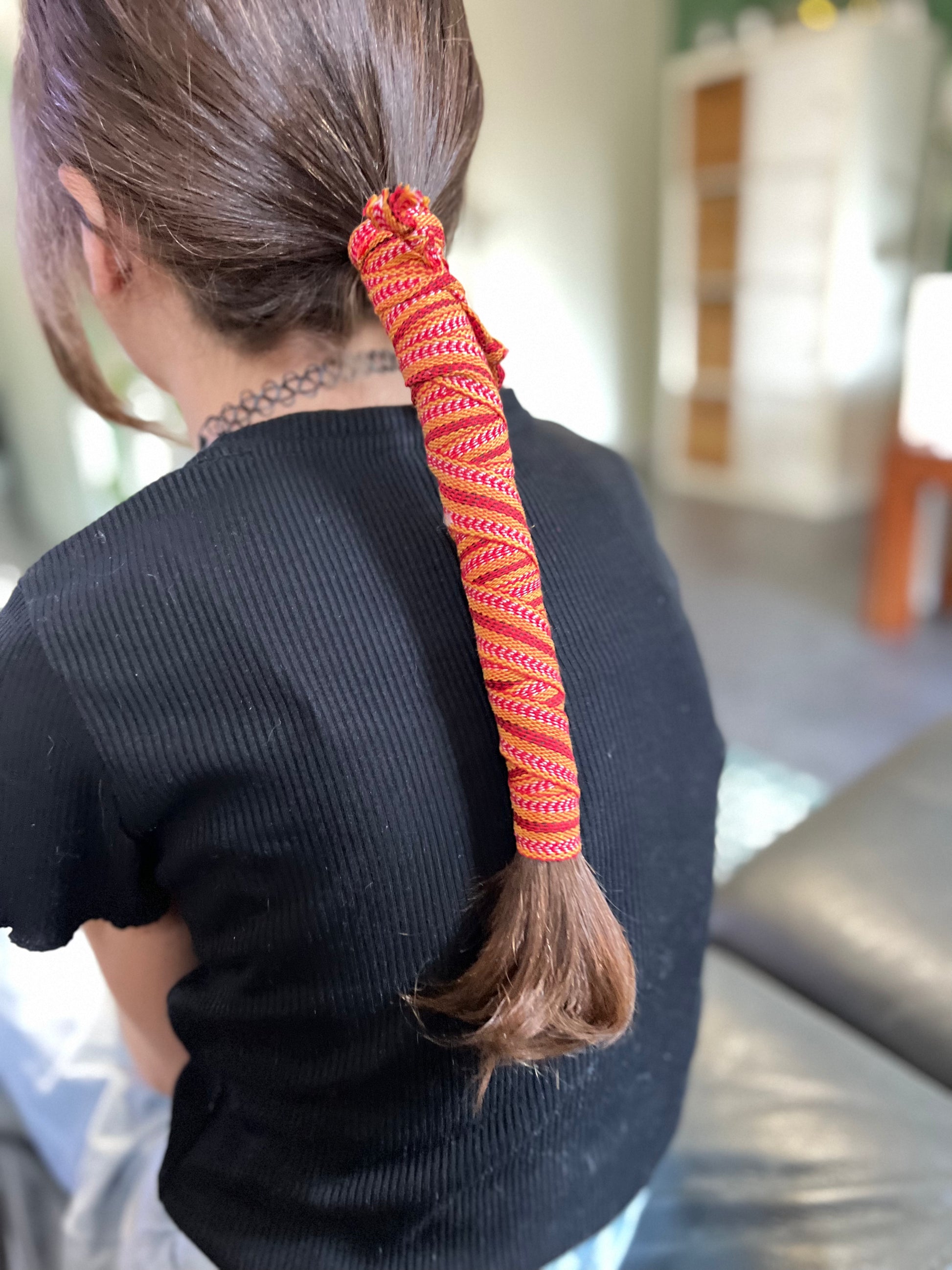 conseil d'utilisation : Sur cheveux propre et sec, démêler les cheveux et attacher les à laide d'un élastique sur la nuque, enrouler le cordon autour des cheveux en serrant bien en veillant à laisser une petite extrémité dépasser pour pouvoir faire un noeud une fois terminé.